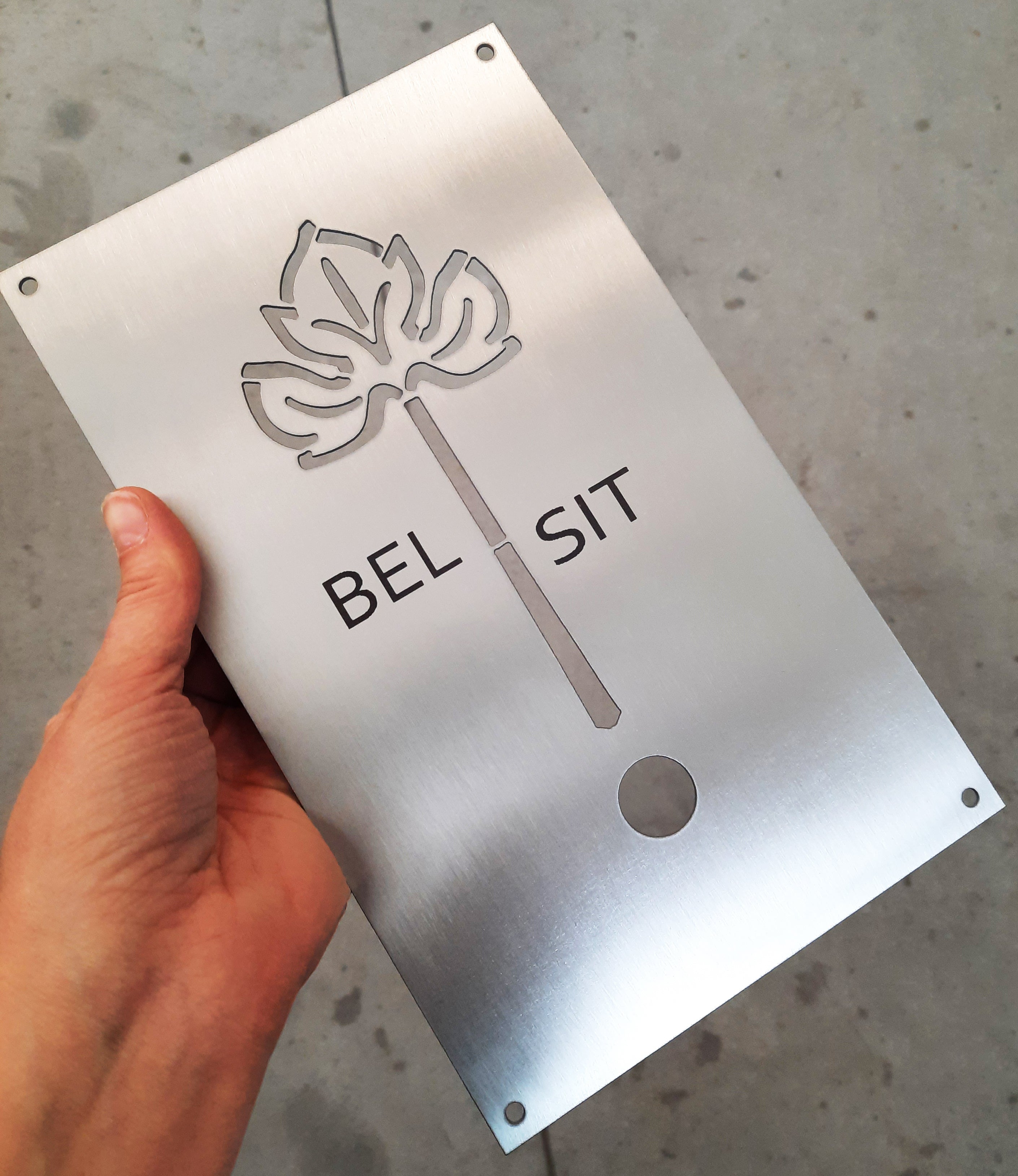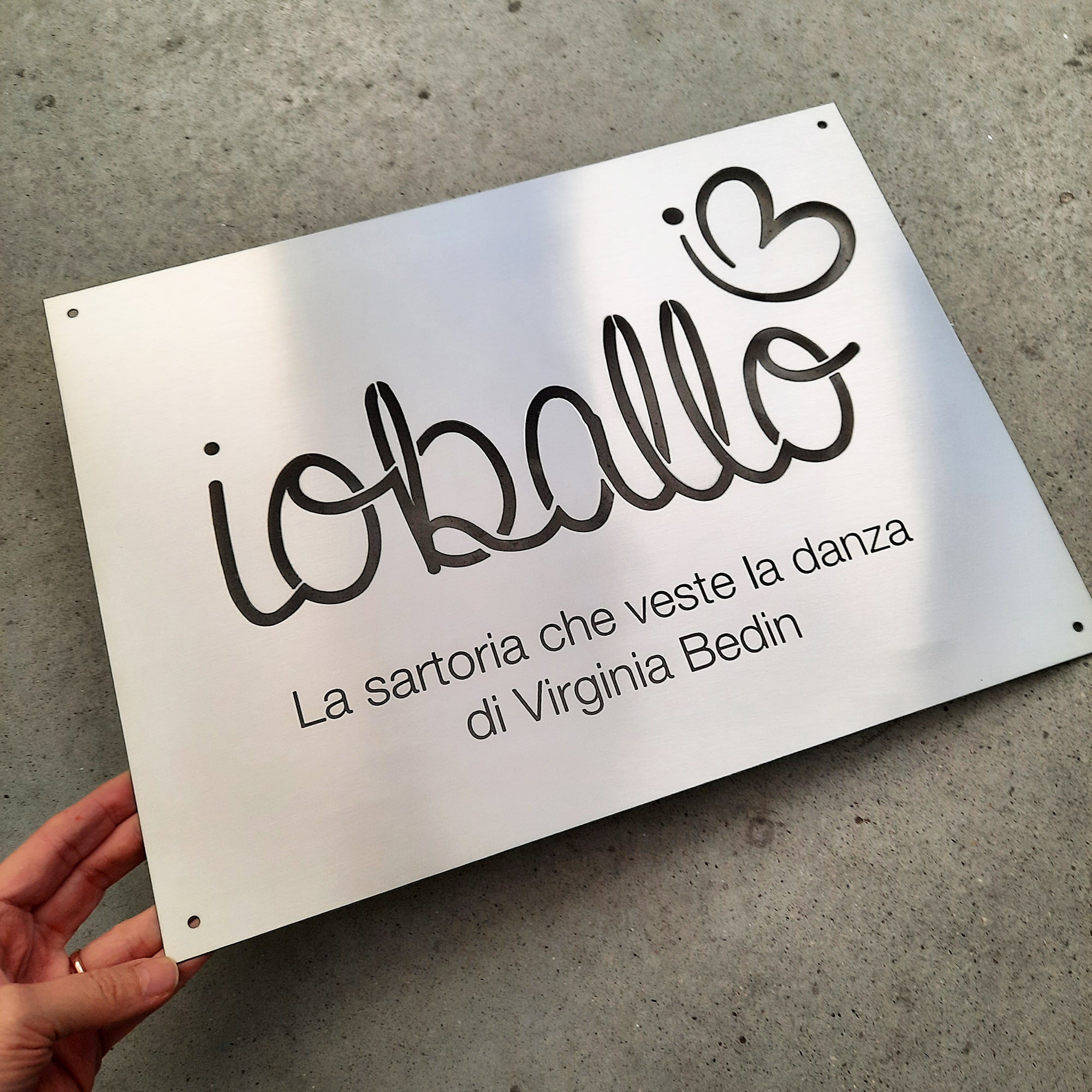 L'insegna è realizzata in acciaio inox di alta qualità, tagliato con tecnologia waterjet, inciso a laser e lucidato a mano.