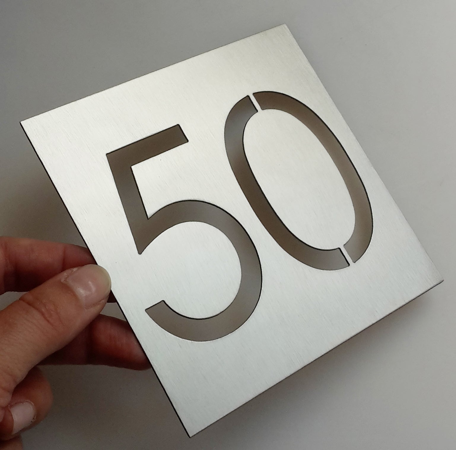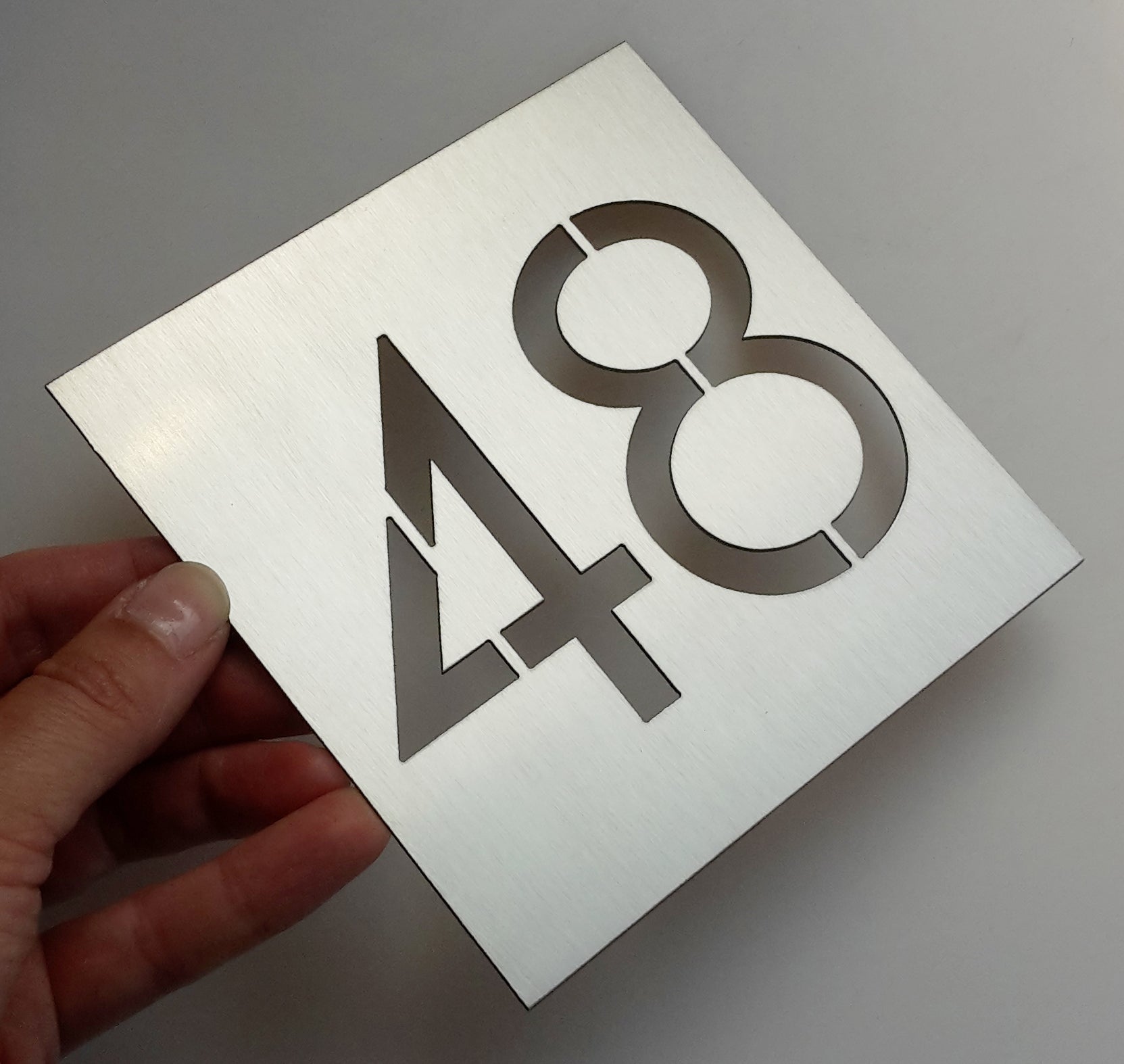 El número de casa está fabricado en acero inoxidable de alta calidad , cortado con tecnología de chorro de agua y pulido a mano .